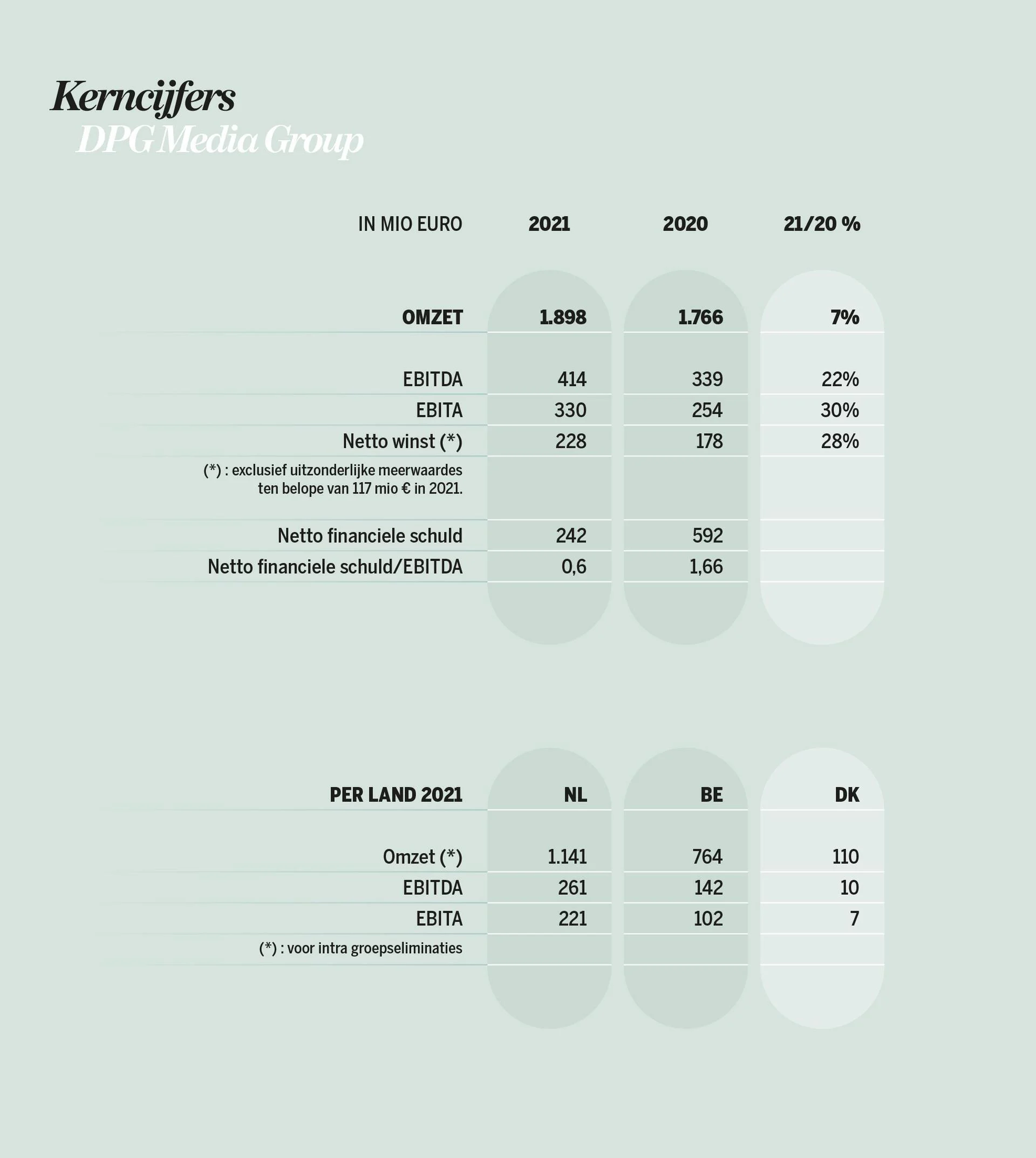 DPG Media a réalisé un chiffre d'affaires de 1,898 milliard d'euros (+7%) en 2021. Ce chiffre d’affaires s’est traduit par une croissance de l'EBITDA de 22%, à 414 millions d'euros. Le bénéfice courant net s’élève à 228 millions (+28%).