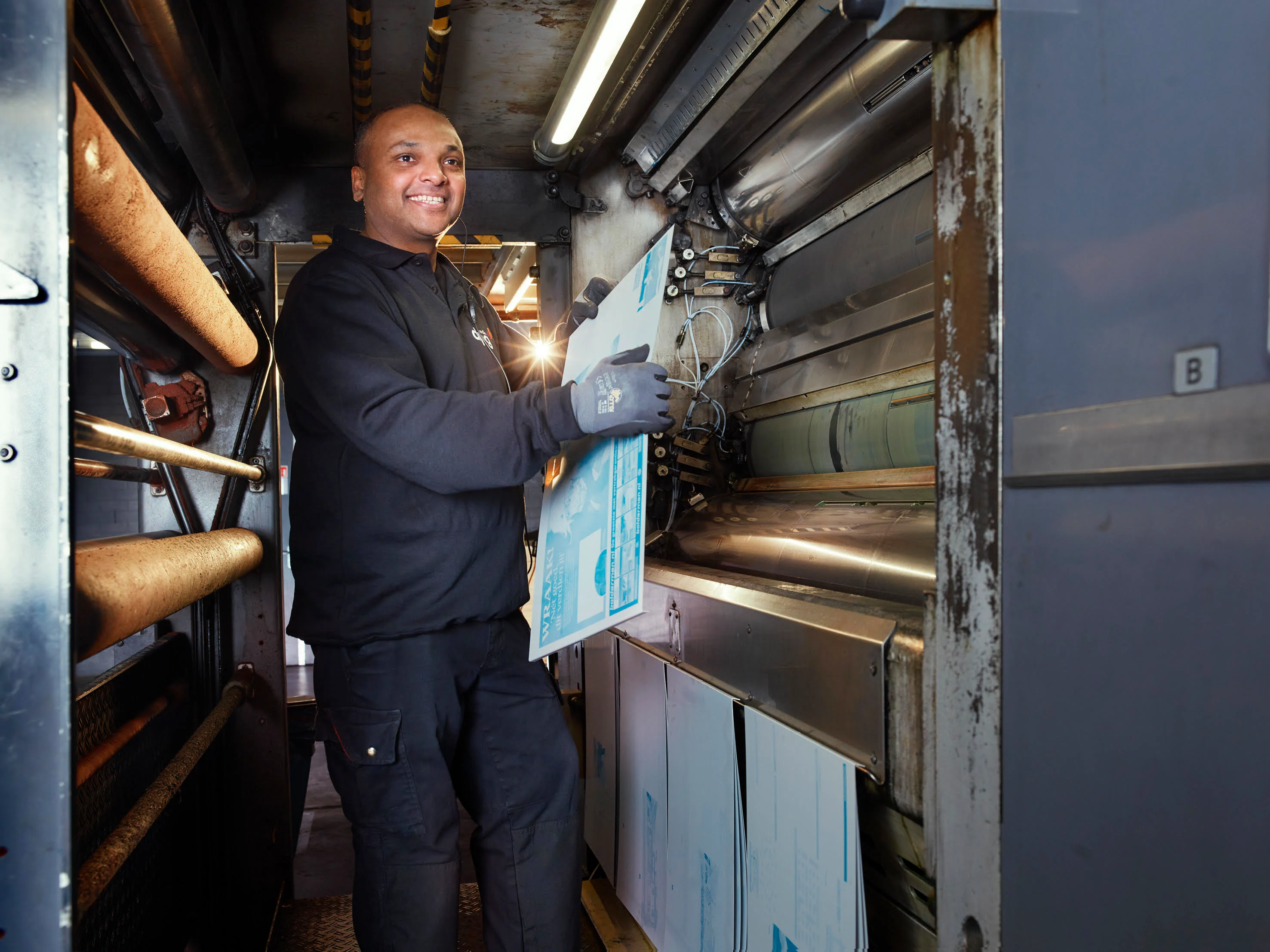 ‘‘Doordat ik honderdduizenden kranten per nacht druk, help ik mee het nieuws te verspreiden door heel Nederland. Als ik na een werknacht de krant de volgende dag in de schappen zie liggen, krijg ik een trots gevoel. Ik heb gewoon die krant gedrukt!’’